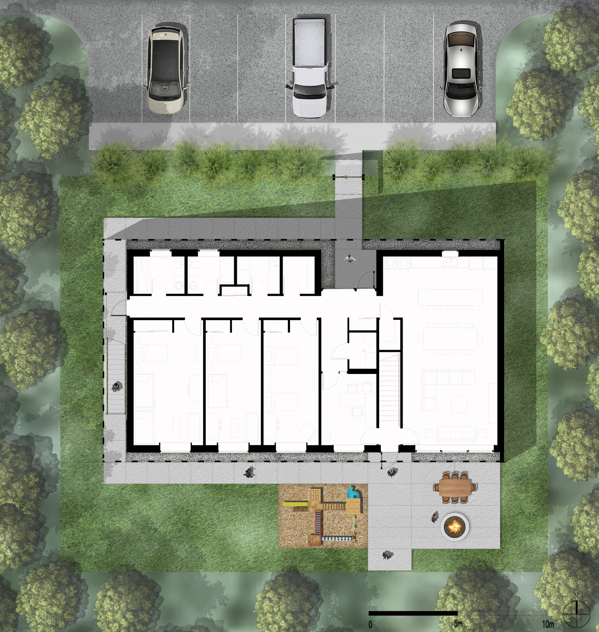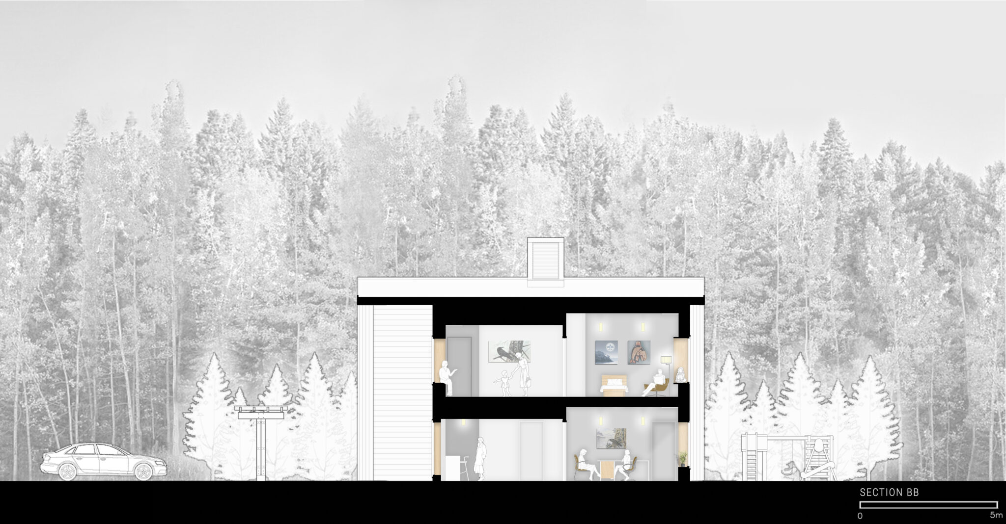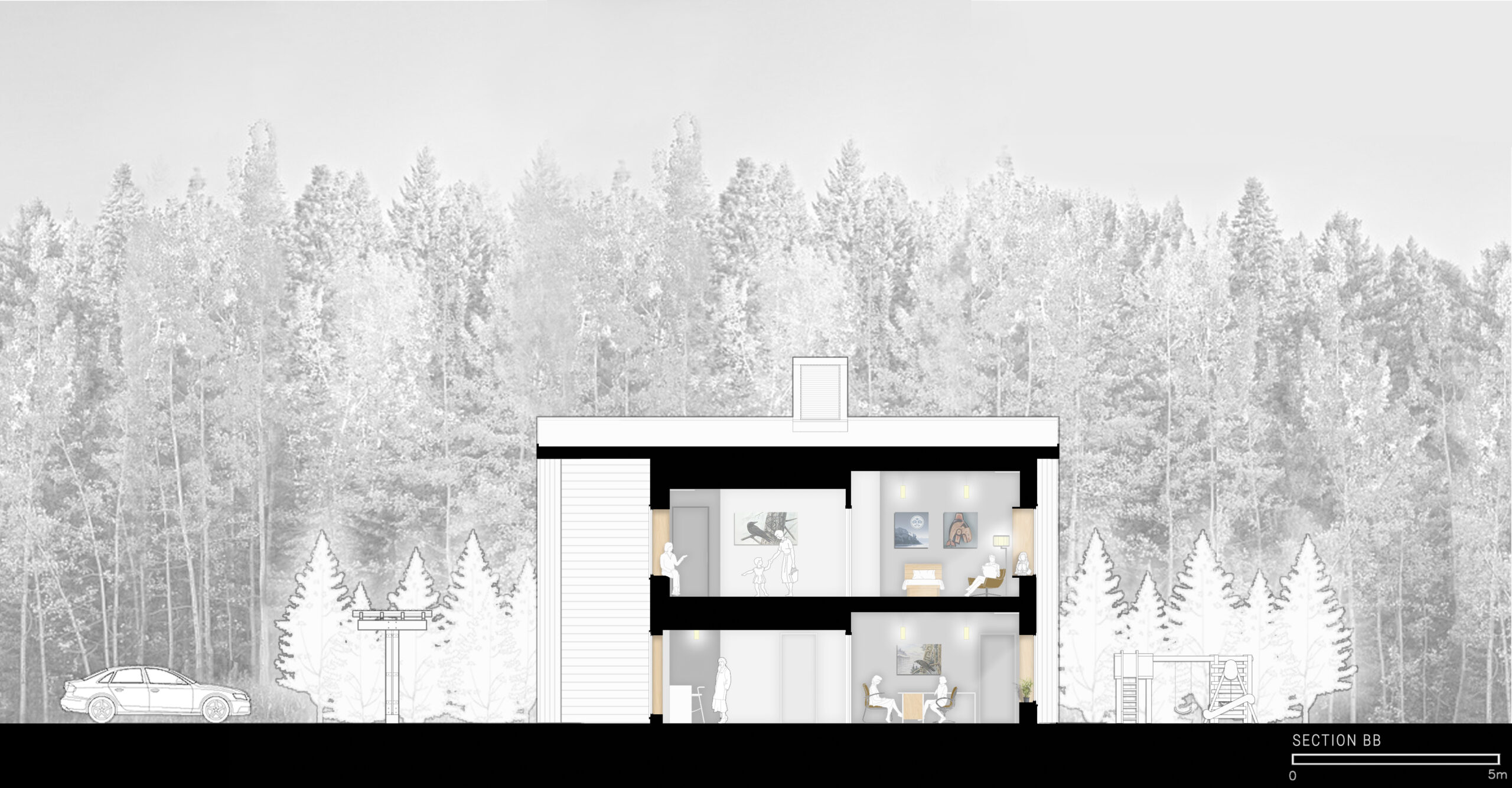 The facility has 7 family rooms on two floors with a capacity of 21 beds. The program includes administration office, communal kitchen and living room on the main floor with a south facing outdoor play and gathering area. On the second floor a multi-purpose space will be used for Counselling and an indoor play area for children. The construction is a prefabricated wood panel system to achieve quality control, schedule and budget requirements. The building is designed to meet Passive House requirements.