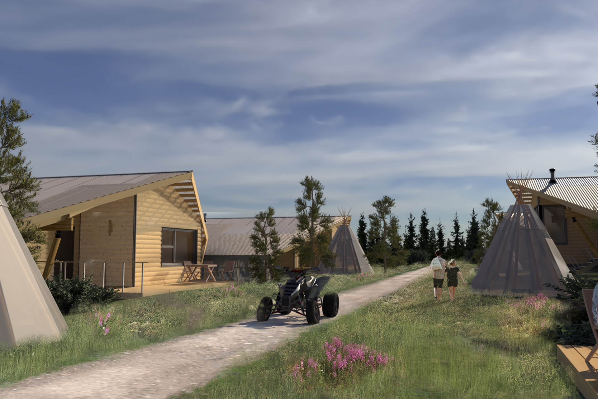 The form and character merges the community’s affection for the log cabin combined with an open translucent shed garage and storage area. The corrugated translucent shed structure relates to the translucent tepee. Current plans are to build 10 units at a deserted runway.