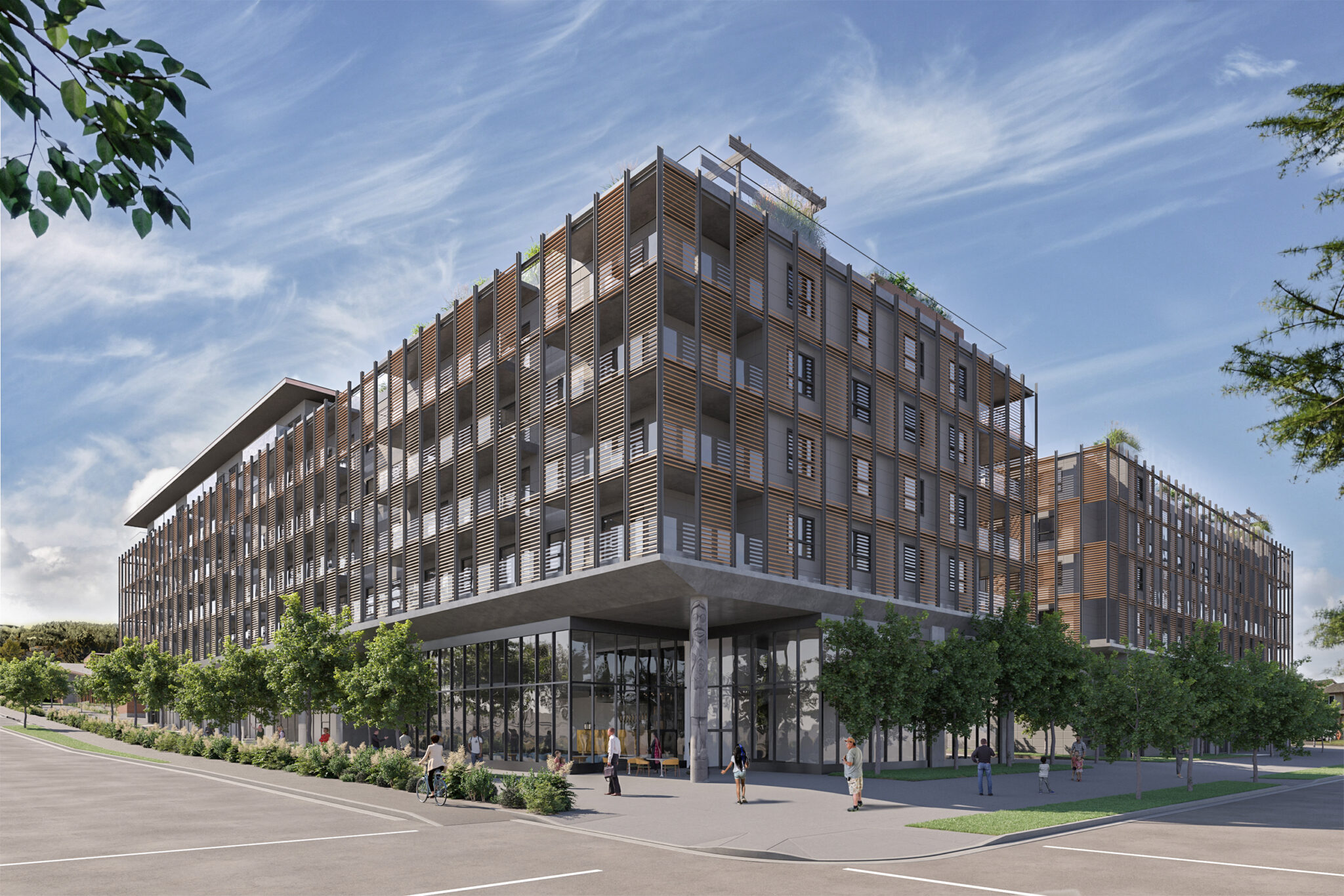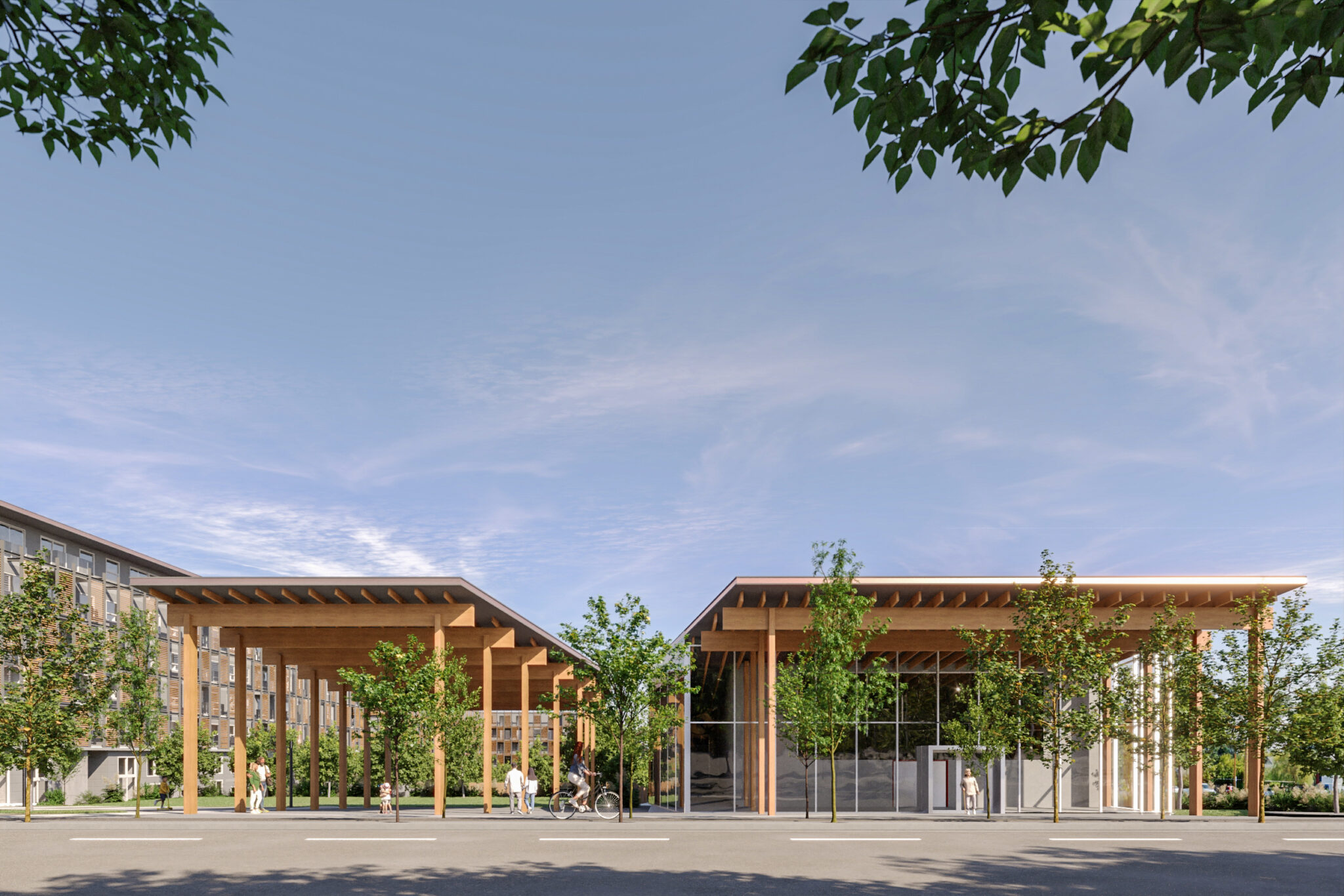 Residential mass timber panelized structures are built over 2 levels of subgrade concrete parkades. A combination of live/work and commercial/community use animate the street with a central courtyard for play, story telling, reflection, outdoor learning and flexible communal use.